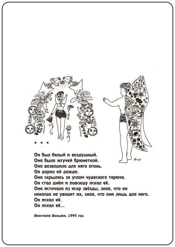 был белый и воздушный. Онбыла жгучей брюнеткой. Онавозводила для него огонь. Онадарил ей дожди. Онскрылась за углом чудесного терема. Онастал днём и повсюду искал её. Онисточала из искр звёзды, зная, что Она онникогда не увидит их, зная, что они . лишь для негоискал её. Онискал её. Он 1998 год