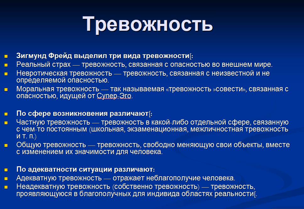 И так, тревожность. Такое сложное понятие, здесь на этом слайде, официальные версии что это. Я вам буду говорить простыми словами. Что такое тревожность? Определиться с понятиями мы не сможем, потому что все кто с этим работаем, кто пишет книги и так далее, не определились с этими понятиями. Давайте определимся так, чтобы когда я буду читать эту лекцию, чтобы было понятно, что я имею в виду. Ну, так, в общих чертах. Чем мы будем отличать страх и тревожность, в том, что страх это выражено конкретно страх чего-то, конкретика, а тревожность это такое состояние общее, волнения. И простыми словами, я здесь попробовала написать, что тревога по определенному поводу это все-таки страх, и тревога без повода это невроз. Тоже самое, что страх без повода это тоже невроз. Здесь я привела пример ОКР, может быть и ипохондрия. И что угодно в принципе. Любой невротический страх. Тревожность и страх это, в общем-то, одно и тоже, только страх это выражено, тревожность это размыто. Есть и у того и у другого понятия два состояния. Норма, и невротическое состояние. Норма, это когда я боюсь чего-то нормального. Там загорелся дом и возник страх. Логично, понятно, норма. Когда я сижу, и думаю, а вдруг будет пожар, это невроз, потому что нет таких условий, нет ситуации, для того, чтобы была какая-то угроза, но при этом я уже тревожусь, это называется невроз.