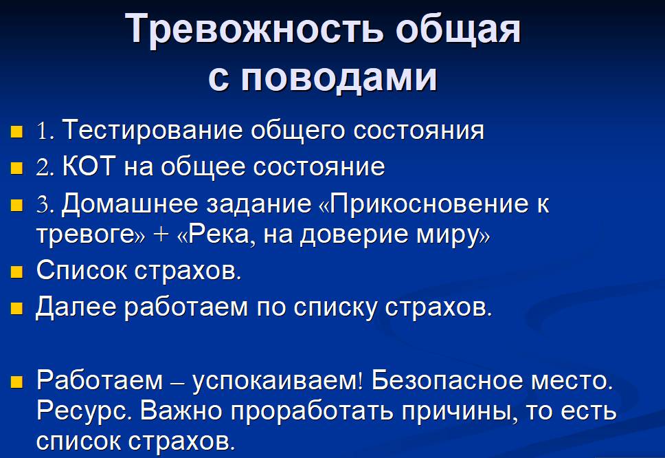 И так, вот теперь подошли к тревожности. Тревожность общая с поводами. С поводами, я имею ввиду, это тревожность, у которой есть много разных причин. И как мы с ней будем работать. Первое, это тестирование общего состояния. Нам надо зафиксировать общее состояние. Но если в страхе все просто, есть страх, мы его оценили от 0 до 10. То тревожность мы оценим по тесту, там более многогранная оценка этого состояния. В данном случае, уже не 1 страх, а там их, скорее всего много. И второй шаг, который я всегда использую, когда у нас есть тревожный человек. Он пришел, вот видно, он не может толком обьяснить что и как, все ему не так, и на работу идти страшно, и на автобусе ехать страшно, и дома самой оставаться страшно. Мы тогда оцениваем общее состояние по тесту, который я чуть позже покажу, и даем сразу КОТ на общее состояние. Все, что вы испытываете в своей жизни, вот это состояние, когда вам и там плохо, и тут плохо, и там страшно, и все не так. На что это похоже? Как будто с кем, происходит что? Передайте мне метафорически это состояние. Как будто что, с кем происходит. И вот это состояние в метафоре, мы уже будем прорабатывать. Изменили в нем один элемент, что-то одно, чтобы стало легче. И в домашнее задание каждый день менять по 1 элементу в этой картинке.