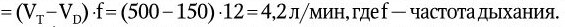 Объемальвеолярнойвентиляцииопределитьтрудно, поэтому в клинической практике чаще всего ограничиваются определением минутного объема дыхания с помощью волюмоспирометра и учитывают при этом частоту дыхания. При частом и поверхностном дыхании, когда резко возрастает объем физиологического мертвого пространства, при нормальном или даже увеличенном минутном объеме дыхания может быть снижен объем альвеоляр•ной вентиляции. Так,•например, при VT=300 мл и f = 20 мин– 1,
