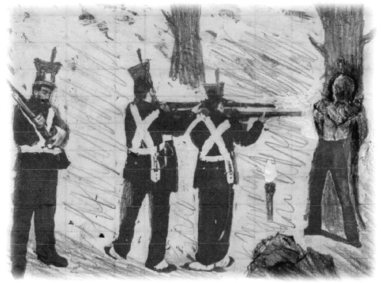 С ездового сняли верхнюю одежду и бросили на снег. Подвели к дереву, и, заломив руки, связали их, его же ремнём, с другой стороны ствола, натянув нательную рубаху на голову, закрыли лицо приговорённого. Затем гвардейцы отошли на несколько шагов и стали готовить оружие. До них доносилось тихое бормотание, в котором угадывались отдельные слова молитвы. Ружейный залп громом разнёсся по окрестностям. Как по команде залаяли и завыли собаки в деревне и в усадьбе.