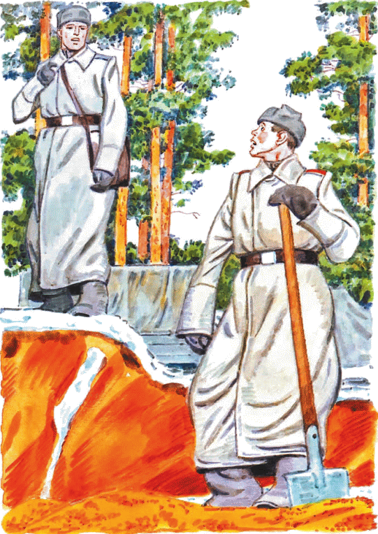 К солдатам пришёл старшина. Он сказал, что дивизион будет стоять тут не меньше недели и надо строить землянки.