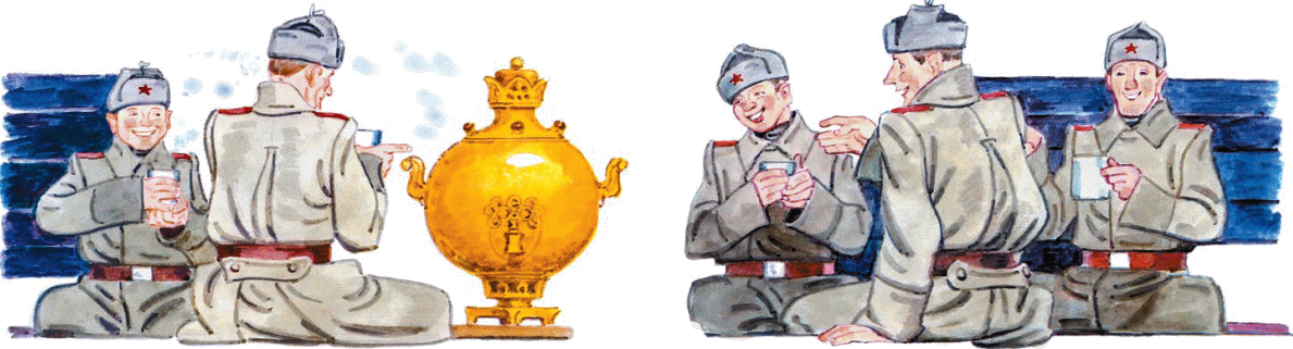 Митины товарищи, как погрузили снаряды, стали пить чай. Кто заваривал в кружке берёзовую веточку, кто подгоревший сухарик. И все хлопали самовар по круглым бокам, будто благодарили за доставленное удовольствие.
