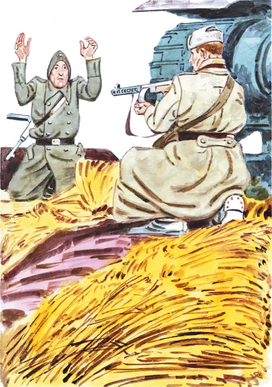 Митин товарищ, ефрейтор Савкин, взял в плен танкиста. Савкин лежал под фашистским танком, подбитым на ничейной полосе, наблюдал в бинокль, откуда бьют вражеские пулемёты. В это время фашист и приполз к танку. Видно, хотел узнать, какие повреждения у машины, чтобы потом увезти её к себе. Ефрейтор подпустил фашиста метров на десять, отбросил стволом автомата маскировку и сказал: «Хенде хох!»[1] Немец метнулся было в сторону, но тут же сообразил, что бежать бесполезно, и, стоя на коленях, поднял руки.