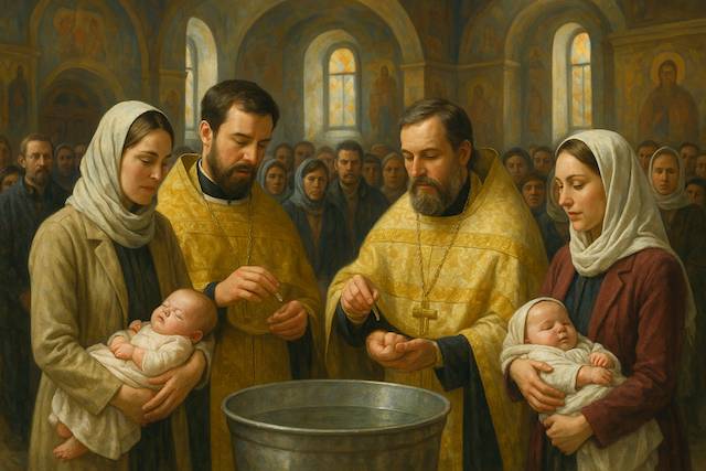 Священники и мамы новорожденных держали младенцев и послушно исполняли все ритуалы. Сверху где -то церковный хор пел свои песни.