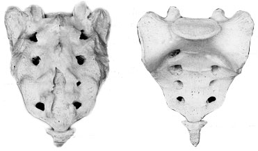 Крестец имеет основание, верхушку, средний и два боковых отдела, образованных путем слияния поперечных отростков крестцовых позвонков. На боковой части расположена бугристая поверхность для сочленения с подвздошной костью. Основание крестца имеет два верхних суставных отростка, обращенных назад и несколько в сторону. Передняя поверхность крестца вогнута, задняя имеет выступы: средний крестцовый гребень (рудименты остистых отростков) и суставной гребень (рудименты суставных отростков). Крестцовый канал образован соединением позвоночных отверстий крестцовых позвонков. Он заканчивается крестцовым отверстием, размеры которого резко варьируются (рис. 3).