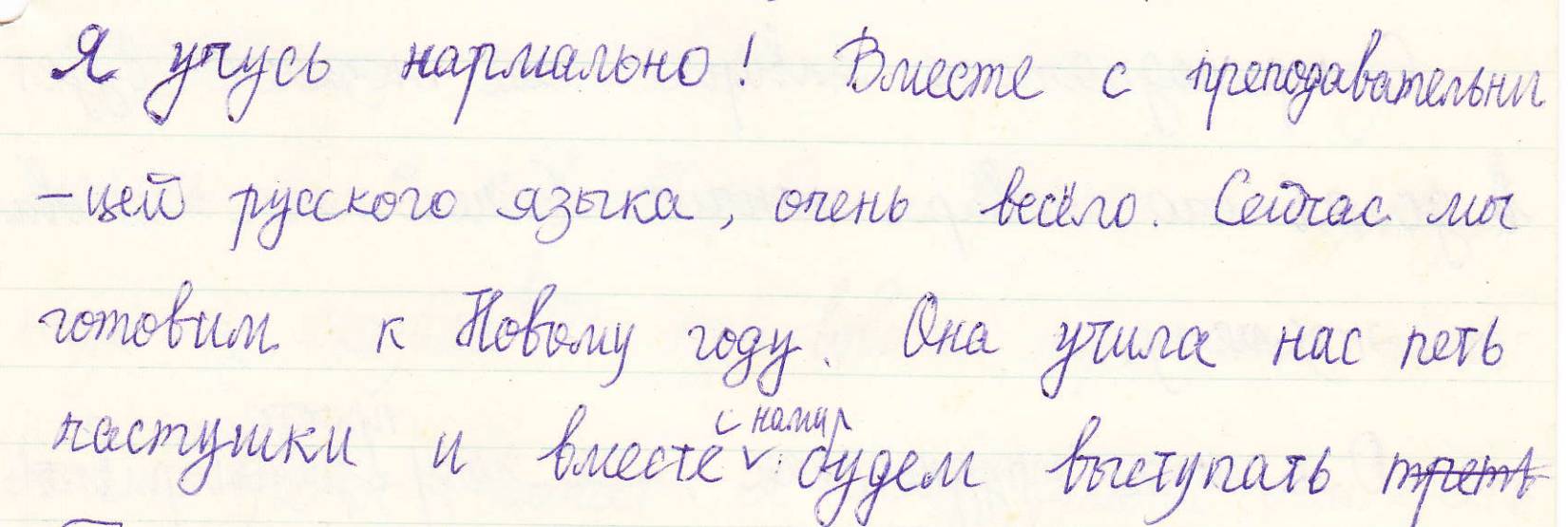 Во второй половине дня они начали праздник в одном из классов. Праздник они готовили уже с новой преподавательницей русского языка, поэтому на празднике были и Дед Мороз, и Снегурочка, были русские танцы, которые исполняли девушки, распевая русские частушки, были и другие выступления учеников.
