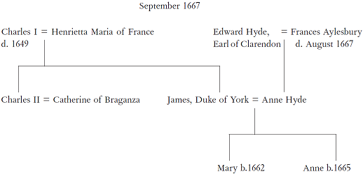 I bowed. A few weeks earlier, the King had removed Lord Clarendon, his oldest adviser, from the office of Lord Chancellor in one of the greatest political upheavals since the Restoration of the monarchy seven years before. But removing Clarendon from office had not made him politically insignificant. His daughter was married to Charles II’s own brother, the Duke of York. Since the King had no legitimate children, and Queen Catherine was unlikely to give him any, the Duke was his brother’s heir presumptive. Moreover, the next heirs in the line of succession were Clarendon’s grandchildren, the five-year-old Princess Mary and her infant sister, Anne. If the King were to die, then Clarendon might well become even more politically powerful than he had been before.