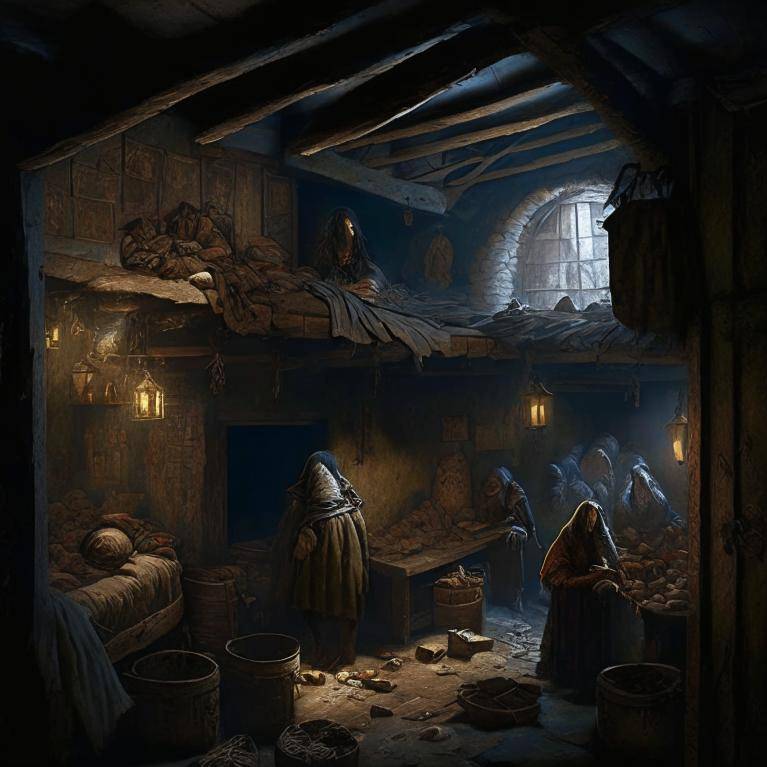 Вся жилая площадь барака разделялась по сферам влияния нескольких группировок – один закуток облюбовал шумный цыганский табор, состоявший из гадалок, конокрадов и бесчисленной своры грязных детишек; далее следовала вечно пьющая малина блудниц, бычар и совсем тёмных личностей, предпочитавших в качестве профессионального инструмента только острые ножи и большие топоры; чуть далее располагались интеллигентные каталы-шулеры; а самый дальний угол делили о чём-то сейчас спорившие карманники и вповалку разлёгшиеся после трудового дня побирушки. Кроватей в общем помещении едва ли насчитывался пяток, и можно было догадаться, что основная масса рядовых жильцов предпочитала почивать прямо на разбросанном по полу тряпье. Кое-где виднелись ширмы, а где-то их роль исполняли лёгкие полупрозрачные занавески. Вполне возможно, отделявшие ареал обитания жриц любви от прочей их клиентуры.