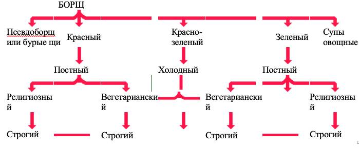 По ингредиентам и способу приготовления, борщ классифицируется в следующем виде: