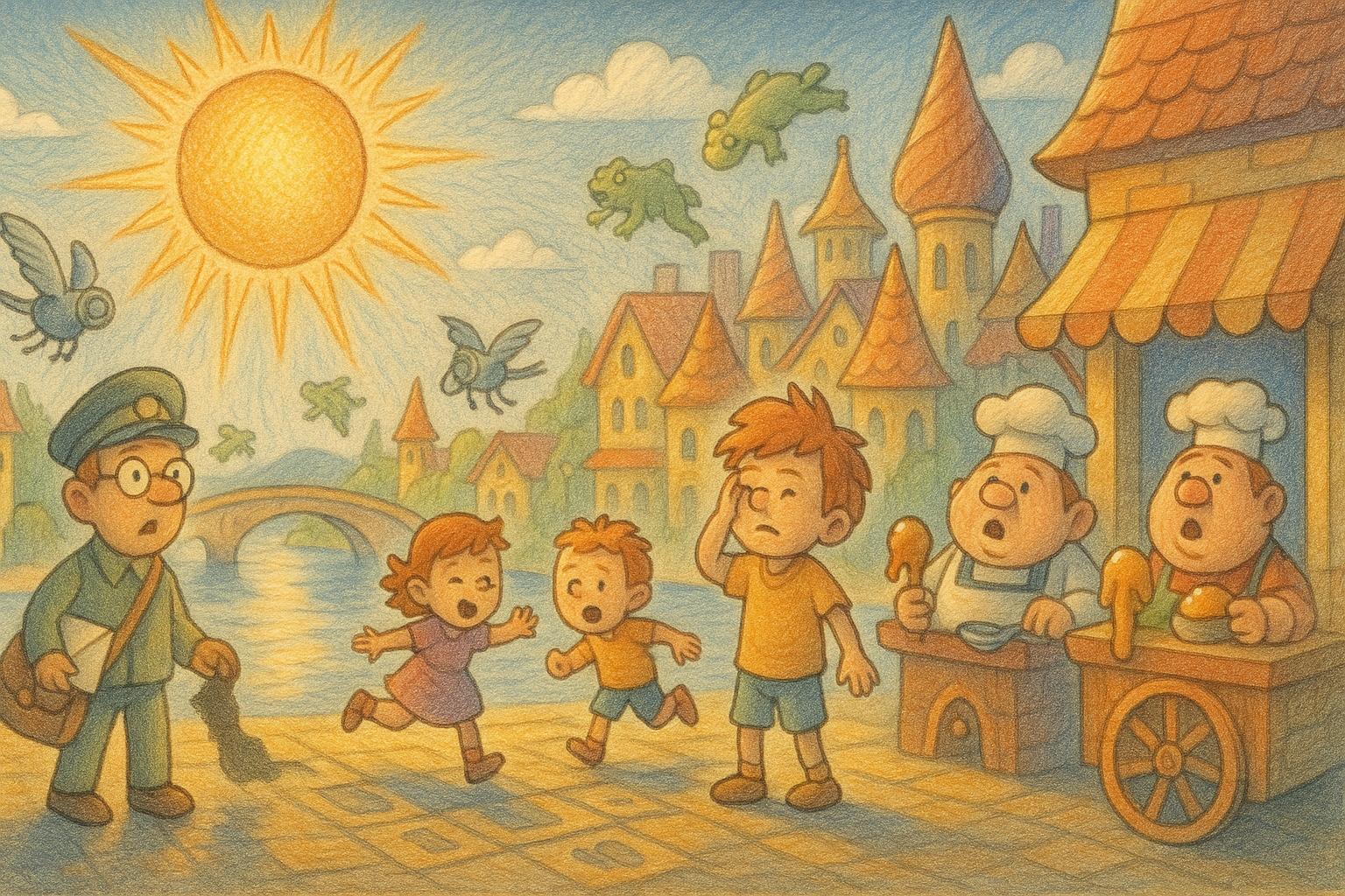 Солнце зависло прямо в зените, будто его подвесили на невидимую золотую нить. Его лучи застыли в воздухе, превратившись в янтарные сосульки. Река Вираж, которая по субботам текла вспять, чтобы дети могли кататься на лодках-пузырях против течения, остановилась и стала зеркалом. Даже мармеладные лягушки, замершие в прыжке, не шевелились.