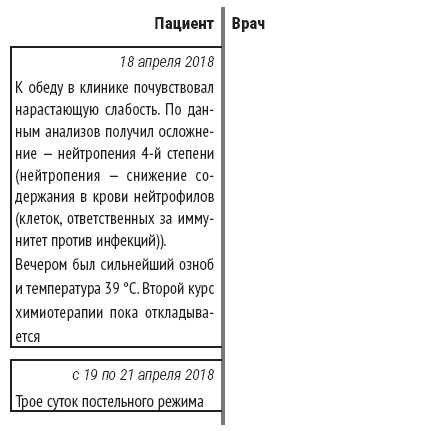 Примерно к обеду поднялась температура – 37,8. Я измерил, сказал ребятам, что мне, наверное, надо эвакуироваться домой, поздравил их с успехом и уехал. Уже в пути меня накрыл жуткий озноб. Я хотел остановиться на обочине, но все-таки доехал до дома, припарковался и, придя домой, упал под два одеяла. Я понял, что это началась фебрильная нейтропения, температура была 38,3. Я оперативно связался со своим лечащим доктором, которая рекомендовала начать прием антибиотиков. И я начал принимать.