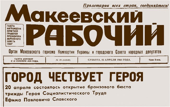 Номер газеты «Макеевский рабочий» с сообщением об открытии бюста Е.П. Славского. [Портал «История Росатома» http: //elib.biblioatom.ru]