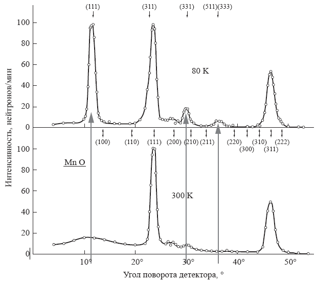 Имеющие нулевой электрический заряд нейтроны обладают, тем не менее, магнитными моментами, которые могут взаимодействовать с магнитными моментами атомов вещества (связанными с круговыми токами движения электронов по орбиталям и их спинами). Таким образом, рассеяние нейтронов в магнетиках может дать информацию не только о расположении атомов в веществе, но и об ориентации в нем магнитных моментов. Так, именно с помощью рассеяния нейтронов в 1949 г. [84] было продемонстрировано существование теоретически предсказанной в начале 1930-х годов Неелем[21] и независимо от него Л.Д. Ландау и Е.М. Лифшицем антиферромагнитной фазы (с антипараллельным упорядочением магнитных моментов) [см., например: 85; 86, с. 237–242].