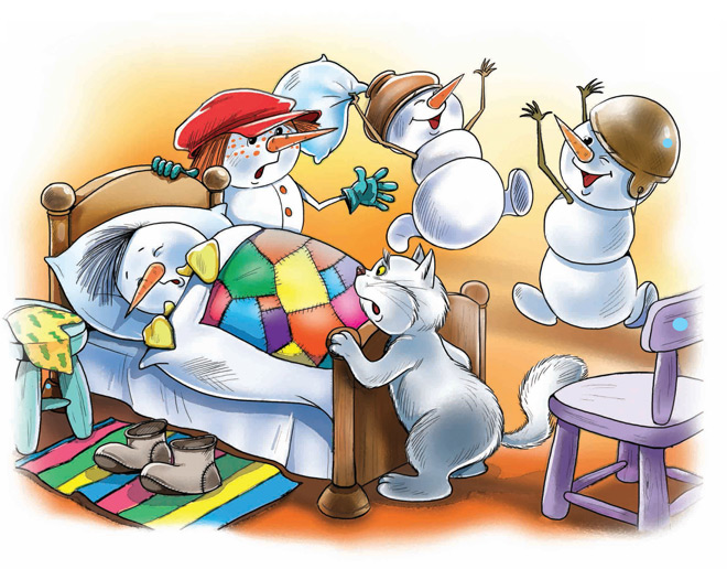 – Варежкин, вставай! – упорно тряс друга за плечо Морковкин. Но тот лежал неподвижно и не просыпался. – Дедушка, Снегурочка! – закричал Морковкин. – Варежкин не встаёт!