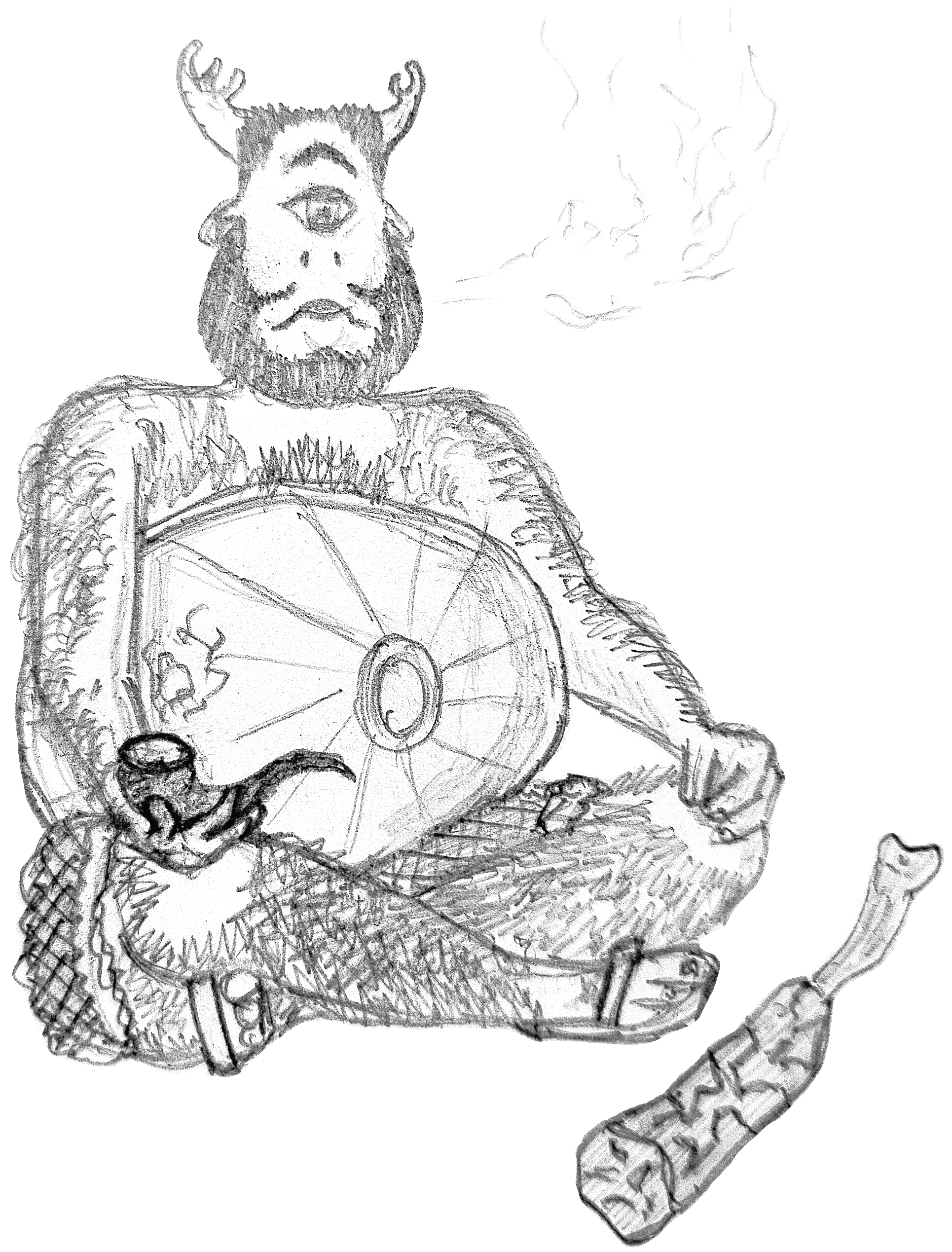 Удивление мальчика трудно не вообразить. Кто это? Маленький – роста не больше полуметра – на бородатом лице один большой глаз, вместо носа лишь две узкие щёлочки, под которыми располагался большой жабий рот, маленькие ушки печально опущены вниз, на руках и ногах по три пальца, а на макушке два небольших несимметричных рога, которые росли из-под копны волос – точь-в-точь как у быка. Пузо его было обрамлено железным щитом – эдакий корсет, – на покрытых шерстью ногах надеты меховые шорты, а ступни обуты в сандалии. По левую руку этого странного существа лежала небольшая деревянная дубинка, а правая держала пыхтящую курительную трубку.