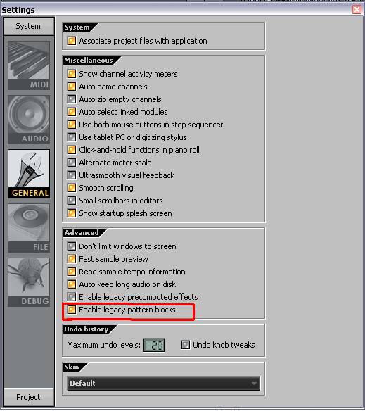 Чтобы начать создавать музыку по моему методу, нужно еще кое-что проделать. Зайдите в меню Options -> General Settings, и в открывшемся окне «поставьте галочку» напротив пункта Enable Legacy Pattern Blocks