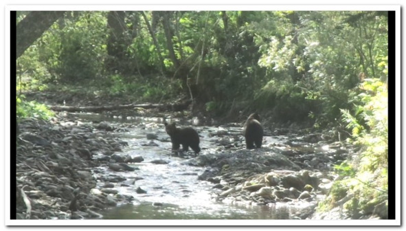 И я не про то, что вскоре после вступления в царство Бадьи я столкнулся с медвежьей семьей. По ходу движения, метрах в 80 на речке сгрудилось два медвежонка и мама их. Споро выхватил фотик, и стал снимать, тихо комментируя, как они меня заметили. Медвежата, засеменив ножками, убежали в кусты, мать же, неспешной походкой уверенной в себе женщины, сперва оглядела меня с пяток до макушки, потянула быстро носом воздух в мою сторону, и исчезла в траве вслед за малыми.