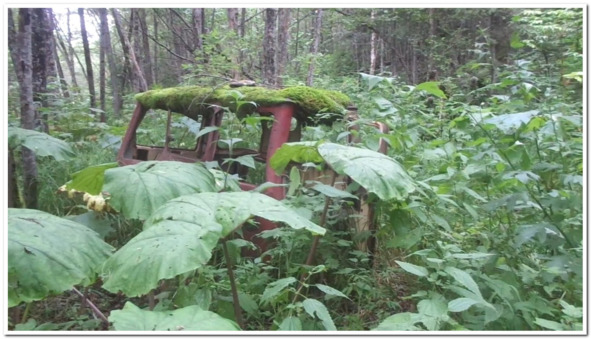Время подбиралось к близкообеденному, от чего в желудке возникло ожидание, идя на поводу которого, я уже стал присматриваться к удобной площадке для посадки. Но пока вместо удобных полян с дровами, тайга вытолкнула меня на выставку машин. Видимо, это была техника связанная с лесопилением. Одна за другой, их квадратные кабины торчали между деревьями. Крышка одной из них, уже прилично покрылась слоем плодородной почвы, оккупированной растительностью. Убранство кабин было бедным, но табличка на одной из них хранила почти всю информацию, которая прошла сквозь время и тайгу. И теперь, благодаря мне, человечество таки получила это важное сообщение, и оно уже не может считаться потерянным.
