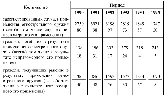 Данные статистики свидетельствуют, что в 1990–1992 гг. на фоне усиливавшейся криминальной экспансии практика применения огнестрельного оружия сотрудниками системы МВД России приобрела явно выраженную тенденцию роста, что хорошо видно из данных табл. 1.