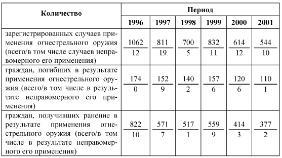 Приведенные цифры, за которыми скрыта не одна трагедия, свидетельствуют прежде всего о том, что количество случаев применения огнестрельного оружия сотрудниками органов внутренних дел определяется тем, насколько часто им приходится сталкиваться с дерзкими, особо опасными преступлениями, т. е. напрямую зависит от уровня насильственной преступности в целом. Но, по-видимому, дело не только в этом. Есть основания утверждать, что сотрудники органов внутренних дел, с одной стороны, стали более ответственно и взвешенно подходить к применению огнестрельного оружия, о чем свидетельствует снижение удельного веса случаев неправомерного применения огнестрельного оружия к общему количеству случаев его применения. Так, количество случаев неправомерного применения огнестрельного оружия в общем числе случаев его применения составило: в 1993 г. – 2,6 %, в 1994 г. – 2, в 1995 г. – 1,1, в 1996 г. – 1,1, в 1997 г. – 2,3, в 1998 г. – 0,7, в 1999 г. – 1,3, в 2000 г. – 1,9, в 2001 г. – 1,8 %. С другой стороны, они не смогли в полной мере преодолеть сформировавшийся у многих из них в предшествующие годы комплекс собственной правовой незащищенности. Не случайно Указом Президента Российской Федерации от 24 мая