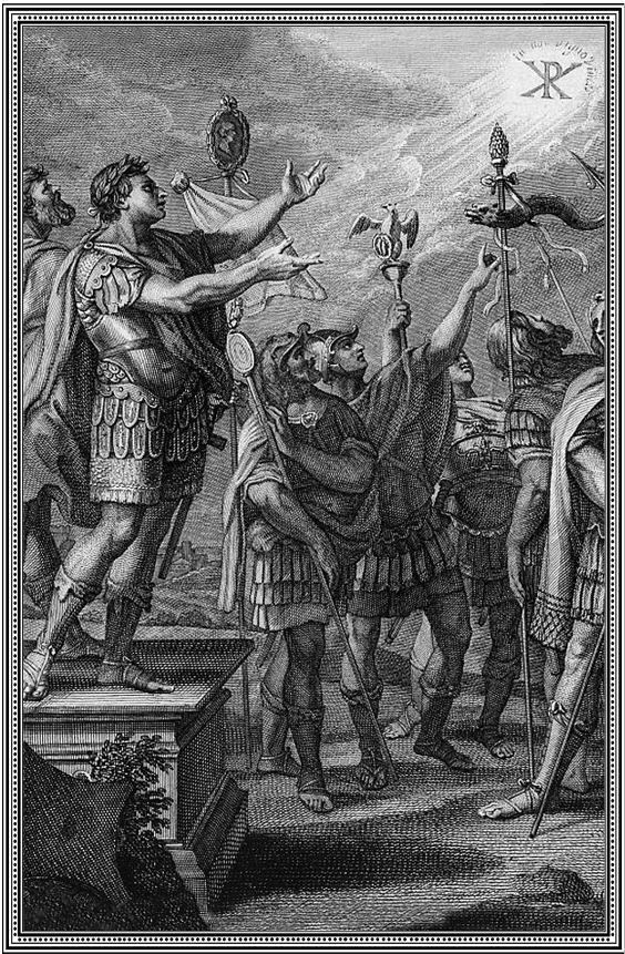 Через месяц после смерти Геркулия Максимина Константин созвал своих военачальников. Сначала он побеседовал с каждым по отдельности, затем провел общий совет. Они собрались в глубине сада императорского дворца внутри небольшого портика, среди зелени, журчащих фонтанов и статуй.