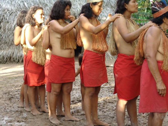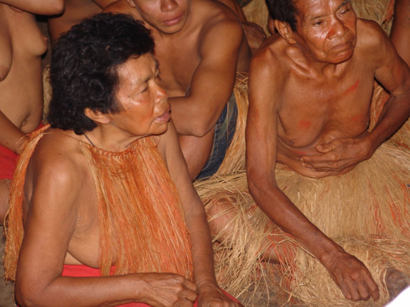 Вечером несколько мужчин и женщин, одетых в пышные юбки из волокон пальмы, приходят в малоку и рассаживаются на земле в центре жилища.