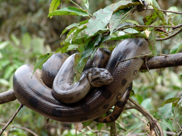 Отдыхающая на ветвях анаконда