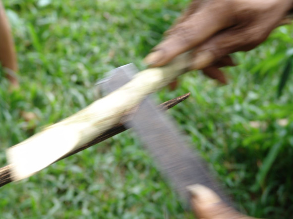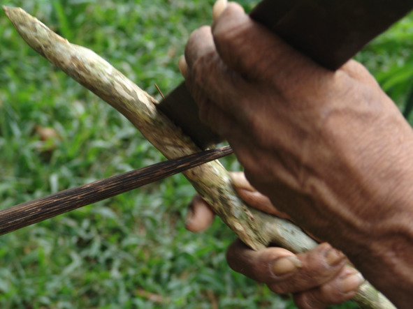 В качестве инструментов используются обломок мачете и деревянный упор