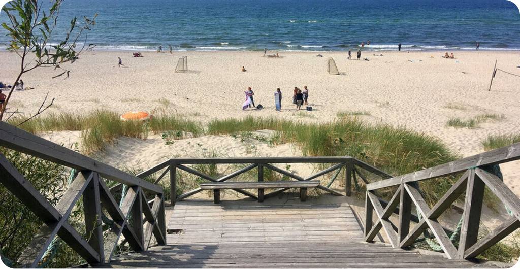 Пляж в Рыбачьем на западном берегу Куршской косы – прекрасное место для семейного отдыха с детьми. Здесь вас ждут приятный мелкий белый песок и пологий вход в воду. Территория ухоженная и чистая, что приятно удивляет туристов. Для тех, кто предпочитает активный отдых, на территории пляжа установлены волейбольные сетки и футбольные ворота. Однако, необходимо учесть, что на пляже отсутствуют лежаки, зонтики и кабинки для переодевания. Также нет душа, но это не критично, поскольку морская вода в Балтике слабосоленая.