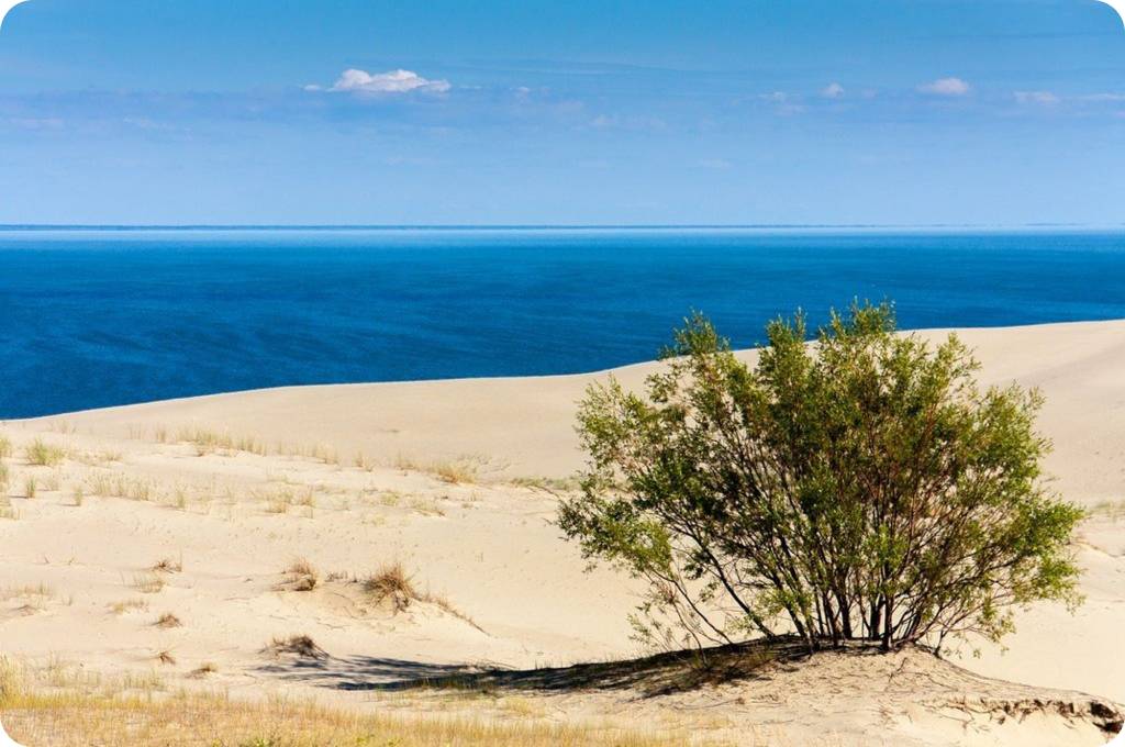 По своим габаритам и высоте дюн (до 70 м), по красоте ландшафтов, богатству флоры и фауны Куршская коса не имеет аналогов среди подобных образований в Европе. Реликтовые рощи, сосновые боры, десятки километров песчаных пляжей и поистине космический пейзаж, открывающийся с вершин высоких дюн. Леса, луга, пустыни и морской простор в сочетании с тихими водами залива, озёр и животными, не испытывающими страх перед человеком. Здесь особый мягкий микроклимат круглый год.