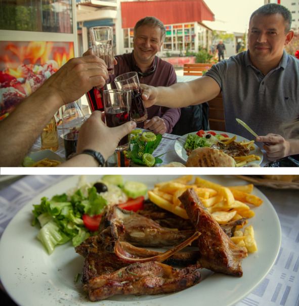 Проголодались и решили отведать гору, виденного ранее на рынке, мяса. В соседним с ним заведении, а ля «У Ашота в Адлере» нам пожарили на углях чудесную говядину и баранину на ребре. Угостились местным красным вином Vranac, под изумительный свежий хлеб. Вот пример поговорки «встретили по одёжке». Это едальное заведение долго потом лидировало в нашем гастрономическом рейтинге страны и его смело можно рекомендовать к посещению (напротив рыбного отдела в здании с торца).