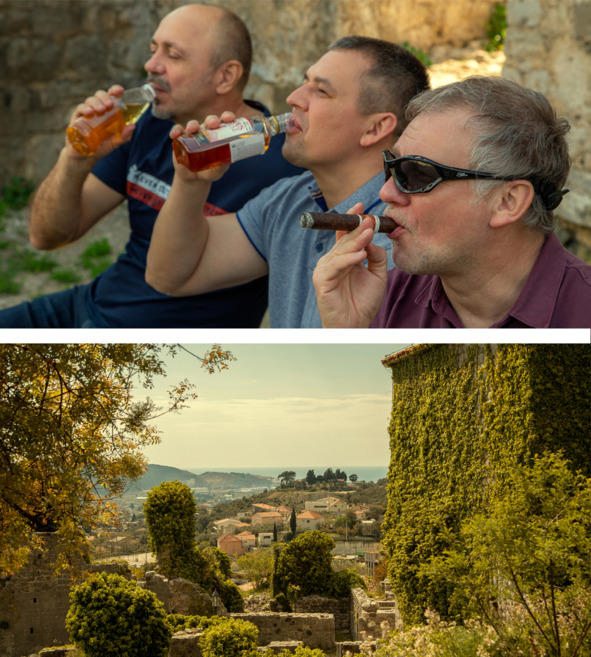 Всего в Старом Баре около 240 строений. Надо ли говорить, что устали. Сели на край крепости и под «Чивас» и сигары «Dunhill» релаксировали на прилегающие живописные виды гор, водопада и красивейшей долины, утыканной домами с оранжевой черепицей уже Нового Бара. Кому-то звонил телефон, и он оправдывался что сейчас в Баре и не может говорить. Правда не уточнил, что в ГОРОДЕ Баре.