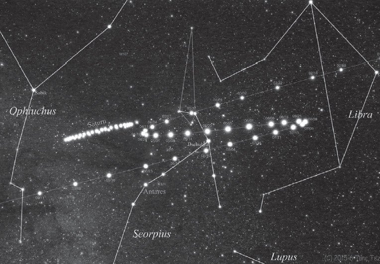 Рисунок 1. Картинка, созданная из серии снимков, сделанных с середины декабря 2015 до сентября 2016 года. На ней запечатлено сближение двух планет: Марса и Сатурна. Их видимое попятное движение относительно звезд дальнего фона – это отражение орбитального движения самой Земли