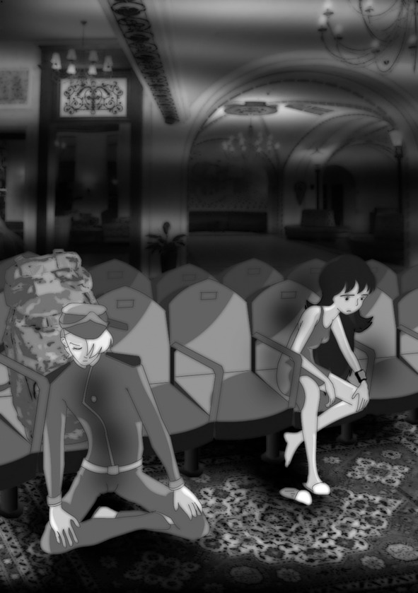 Когда шаги дамы стихли, брюнетка вылезла из своего укрытия и подошла к юноше. Осмотрев шаль, которой он был укрыт, девушка хотела было вернуться в номер, как ее остановил довольно громкий крик:
