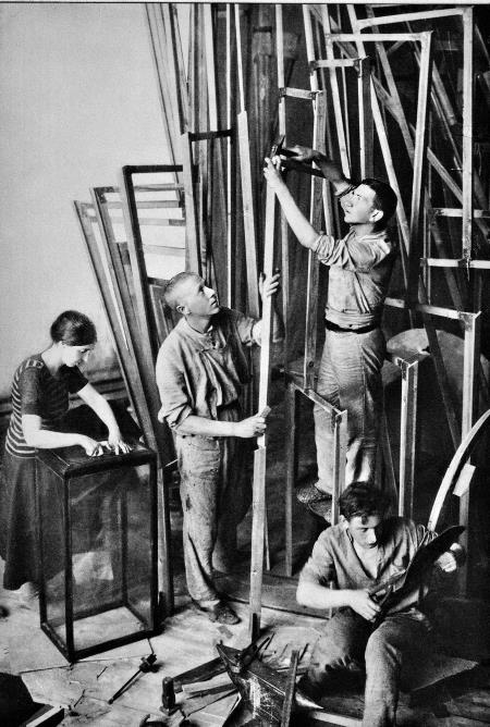 Владимир Татлин с помощниками (слева София Дымшиц-Толстая, стоит Тевель Шапиро, сидит Иосиф Меерзон) за работой над моделью «Памятника III Интернационалу».