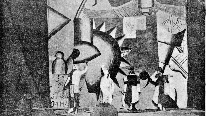 В начале декабря 1913 года произошло событие, ставшее вехой в истории русского авангарда. В театре «Луна-парк» состоялись «первые в мире постановки футуристов театра» – трагедии Маяковского «Владимир Маяковский» и оперы «Победа над Солнцем». Именно в «Победе над Солнцем» соединились самые яркие и мощные силы авангарда – построенная на диссонансах музыка Михаила Матюшина (он исполнял ее на расстроенном рояле), заумные тексты Велимира Хлебникова и Алексея Крученых, декорации и костюмы Казимира Малевича. Впоследствии Малевич утверждал, что именно тогда у него родилась идея «черного квадрата». Постановка получилась во всех отношениях новаторской.
