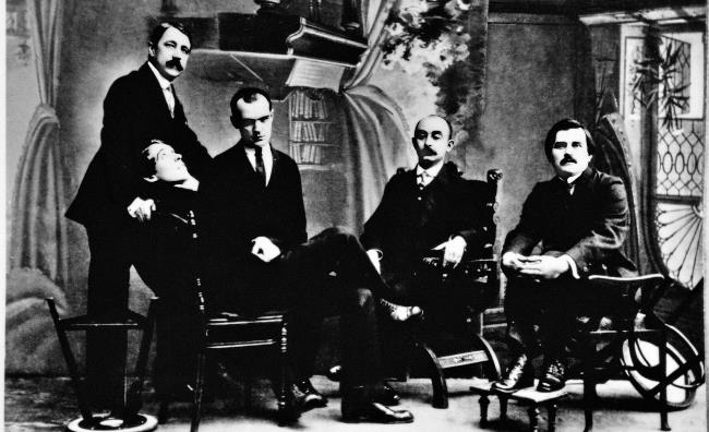 После спектаклей в «Луна-парке». Слева направо: Михаил Матюшин, Алексей Крученых, Павел Филонов, Иосиф Школьник, Казимир Малевич. Фото Карла Буллы. Санкт-Петербург. 1913