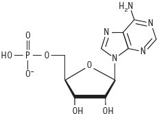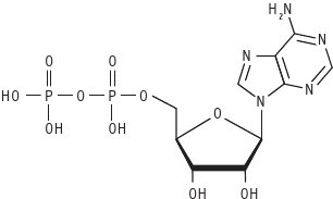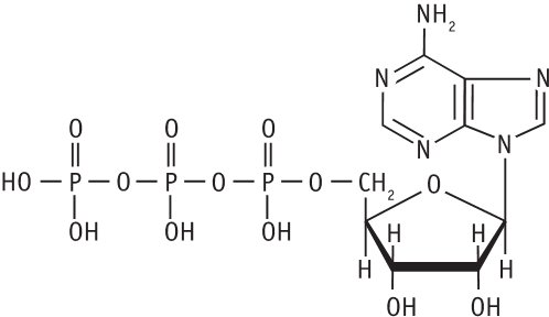 Энергия высвобождается при гидролизе3 АТФ, когда от молекулы последовательно отщепляются остатки фосфорной кислоты (на формуле они видны слева). При отщеплении концевого остатка фосфорной кислоты АТФ переходит в аденозиндифосфорную кислоту (АДФ), при отщеплении второго остатка фосфорной кислоты – в аденозинмонофосфорную кислоту (АМФ)4.