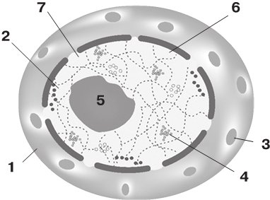 1 – наружная ядерная мембрана; 2 – внутренняя ядерная мембрана; 3 – рибосомы; 4 – хроматин; 5 – ядрышко; 6 – кариоплазма; 7 – ядерная пора