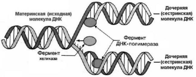 Процесс репликации происходит так. Двойная нуклеотидная цепочка разъединяется, и по каждому из фрагментов начинают «ползти», то есть перемещаться, белковые комплексы, содержащие фермент[5] под названием ДНК-полимераза. ДНК-полимераза считывает информацию с материнской цепочки и на ее основе создает новую цепочку. Таким образом в ходе процесса из одной молекулы ДНК образуются две дочерние, каждая из которых содержит половину (одну цепочку) материнской ДНК. Разъединение двойной спирали для копирования обеспечивает особый фермент, который называется хеликазой. Хеликазу можно сравнить с ножницами, разрезающими связи между цепочками.