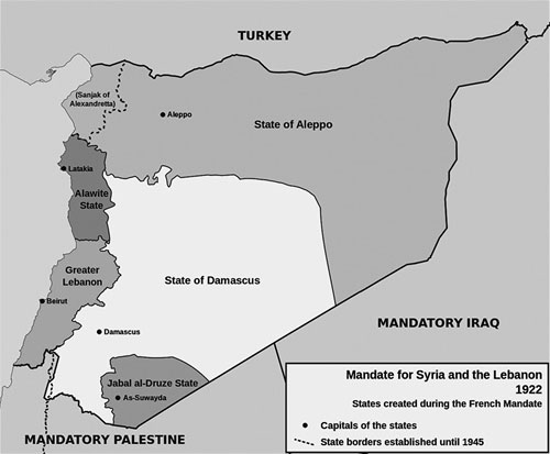 Однако к этому времени за его спиной Великобритания уже договорилась отдать Сирию Франции в обмен на отказ от богатой нефтью области Мосул (на севере Ирака). В апреле 1920 года на конференции в Сан-Ремо союзники поделили контроль над бывшими территориями Османской империи – Великобритания взяла под свой контроль Палестину, Трансиорданию и Ирак, а Франция 1 декабря 1920 года объявила своей подмандатной территорией Сирию и начала наступление своей 60-тысячной армией от побережья Средиземного моря на восток. Вскоре французы вступили в Дамаск и изгнали Фейсала. Арабское королевство Сирия было ликвидировано, и французы разделили страну на несколько «самоуправляемых» территорий, которые находились под их фактическим контролем – Дамаск, Алеппо, Большой Ливан, государство алавитов и Джебель-Друз.