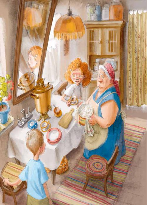 Бабушка вышла к гостям. Красавицы поклонились в пояс, а высокая девица достала из корзинки румяную булочку, похожую на сосновую шишку, и протянула бабушке: