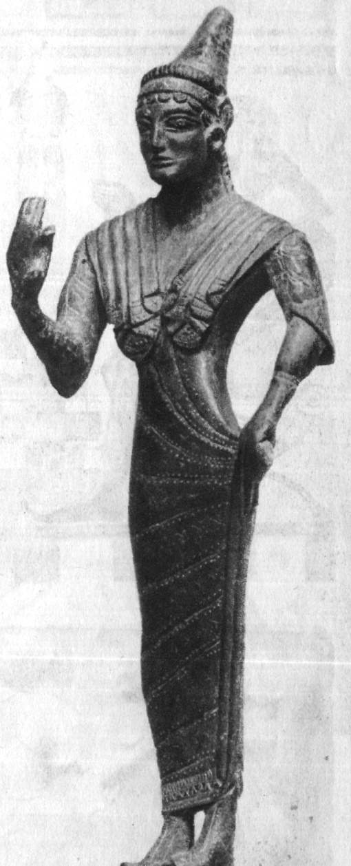 Etruscans. Female figurine from Perugia. Early 5th century BC e. State Museum. Berlin The woman is dressed in a fitted tunic that reaches her ankles and a short cloak. On her head is a conical cap resembling a Phrygian cap, her hair is braided. Kibalova L. – Gerbenova O., Lamarova M., Illustrated Encyclopedia of Fashion, Artia, printed in Czechoslovakia, 1986, p. 69.