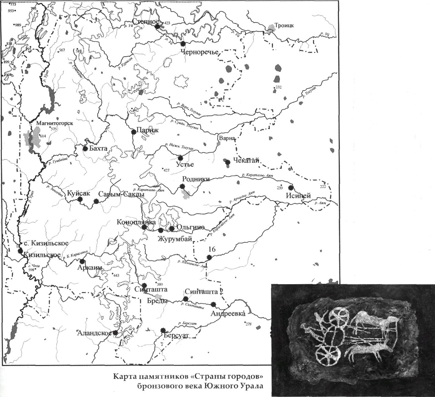 Map of the monuments of the "Country of Cities" of the Bronze Age of the Southern Urals. Chariots from the steppes of the Southern Urals. In the Southern Urals (Chelyabinsk and Orenburg regions, Bashkortostan, Northern Kazakhstan) there is a famous archaeological culture, including dozens of similar monuments of antiquity, named after the most famous settlement – the Arkaim culture (according to Arkaim in the Chelyabinsk region, 26 cities-settlements have been found at the present time in the Chelyabinsk, Orenburg regions, Bashkortostan and northern Kazakhstan). The "Country of Cities" is located in the territories of the Chelyabinsk Region, Orenburg Region, Bashkortostan of the Russian Federation and northern Kazakhstan. The settlements are scattered over an area with a diameter of 350 km . The term "Country" best characterizes this location of cities. In addition to the fact that all the cities found were built on a compact territory in the same period of time, in the same architectural style and using the same engineering solutions, similar materials, other unifying properties are also viewed. The cities of the Sintashta culture were inhabited by people of the same ethnic group (belonging to the Caucasians) and conducted similar economic activities. The age of the monuments is 3700 years old, the youngest of them. The presence of the so-called Magnetic Mountain, magnetism (modern Chelyabinsk region), apparently influenced the formation of ancient human settlements here, as well as on the territory of the modern Voronezh region in Kostenki, where the Kursk magnetic anomaly takes place. An ancient legend tells that a shepherd near the town of Magnesia in Asia Minor (now Turkey), in search of a sheep, went to the mountains where there were black stones and noticed with amazement that his stick with an iron tip stones attract to themselves, as if the stick attracts and holds an invisible hand, or maybe the hands, the shepherd took them to the city showed all residents that "magic" stones attract iron things, in addition, these same iron things attract other metals. And these stones were magnetic ironstone, which was named magnet on behalf of this city. Magnetism was known in Ancient Greece and Ancient Rome, the Chroniclers of Ancient China wrote about magnetic gates through which enemies with metal weapons could not pass. The multi-armed dancing Indian Shiva may be demonstrating a manifestation of magnetism.