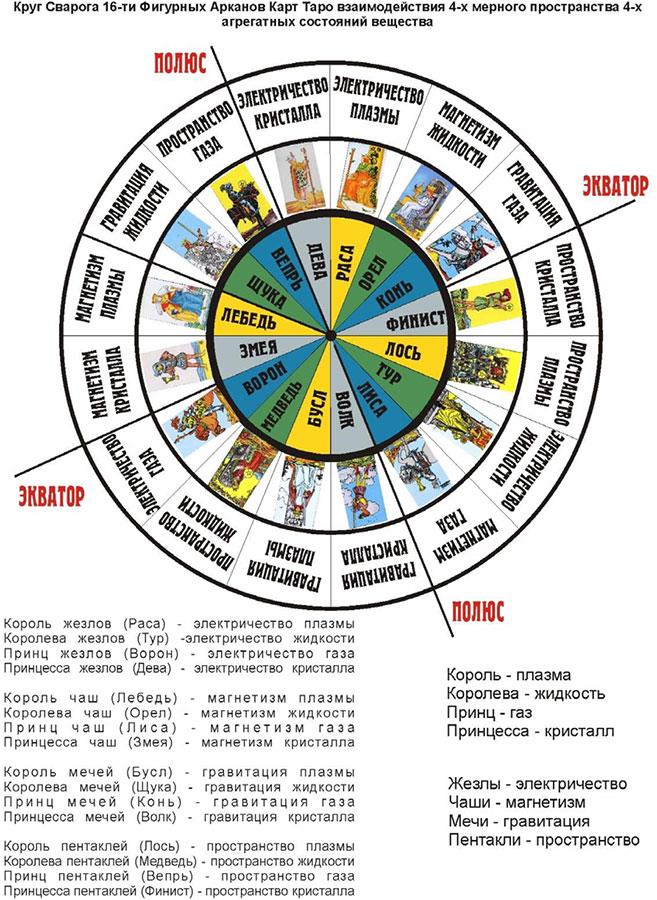 2 Часть «Философского камня» – 16 Фигурных Арканов Карт Таро соответствующих протозодиаку «Круга Сварога» Древнеславянского календаря как Теория взаимодействия 4-х мерного пространства 4-х агрегатных состояний вещества. Разъяснение Библейского мифа искушения Адама и Евы Змеем, Видений Иезекииля, значения символа Георгия Победаносца пронзающего Змея.