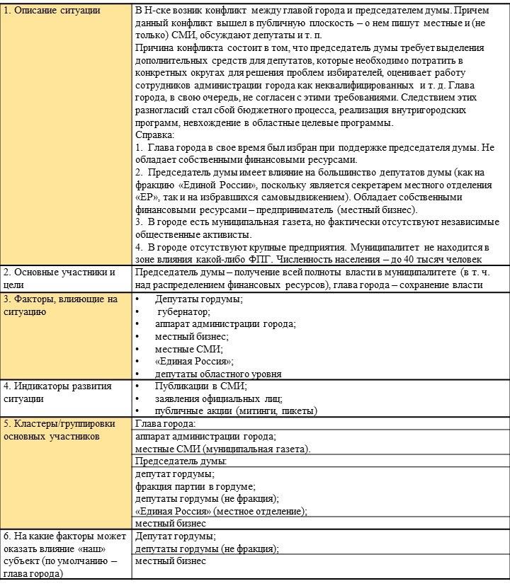 1. Н-ск – промышленный город с количеством населения до 70 тысяч человек. В городе несколько промышленных предприятий, в том числе одно крупное. Выборы в местную думу прошли два года назад.
