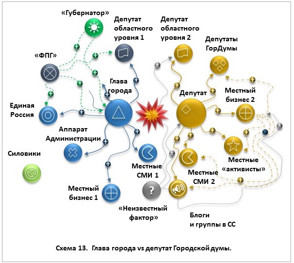 1. В приводимых моделях мы постарались отразить максимально возможное количество факторов и кластеров, которые потенциально имеют возможность влиять на ситуацию и/или ее участников. В этом случае при столкновении с похожим реальным конфликтом аналитику придется лишь «отсечь лишнее» – оставить только нужные элементы конструктора.