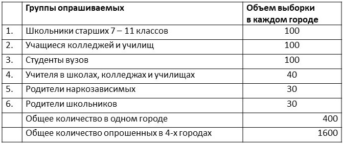 Попадая на «точку» интервьюер отбирает на основе скрининговой анкеты (см. Приложение № 3.) респондентов для участия в основном опросе. В результате скрининга отбираются респонденты, которым а.) знакомы люди, регулярно употребляющие наркотики и б.) известны общественные организации, работающие в сфере противодействия распространению наркотиков. Размер выборки планировался из расчета, чтобы среди опрошенных оказалось не менее 400 респондентов.