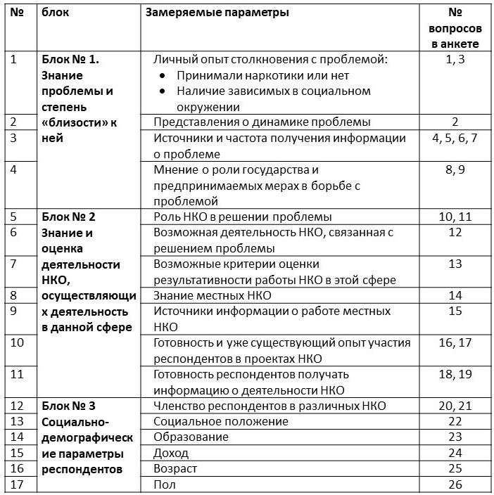 Итогом экспертного опроса является аналитический отчет, отражающий в себе структуру параметров оценки эффективности деятельности некоммерческих организаций с точки зрения основных социальных институтов, с которыми взаимодействуют НКО.
